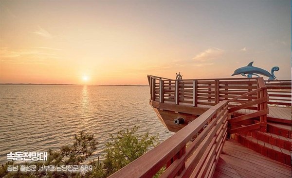 속동전망대는 홍성 해안의 멋진 경관을 한눈에 볼 수 있는 명소예요. 타이타닉 영화의 한 장면을 연상시키는 포토존과 함께 장엄한 천수만의 전망을 즐길 수 있어요. 특히, 낙조가 장관이라고 해요!